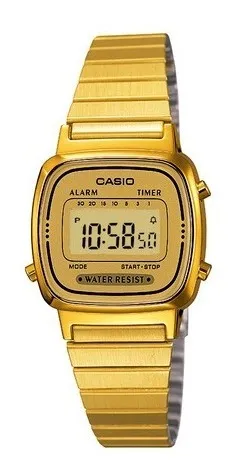 Marca Casio Linha Vintage Modelo LA680WGA-1BDF Modelo alfanumérico LA680WGA-1BDF Gênero Sem gênero Cor da caixa Dourado Material da correia Aço inoxidável Outras características