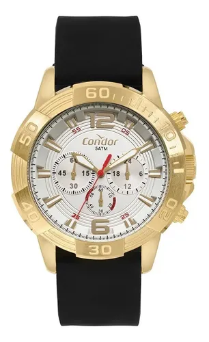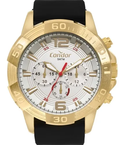 O relógio masculino dourado Condor tem um pegada robusta, pensada para homens que querem se destacar. Com maquinismo multifunção, o modelo tem um aro dourado super expressivo e mostrador na cor branca que se destaca por seus marcadores e detalhes em vermelho. Possui pulseira de silicone preto e resistência à água de até 5 ATM.