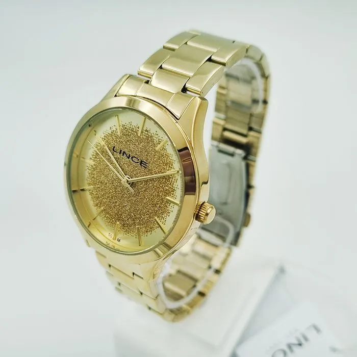 Características: com caixa dourada e pulseira em aço
