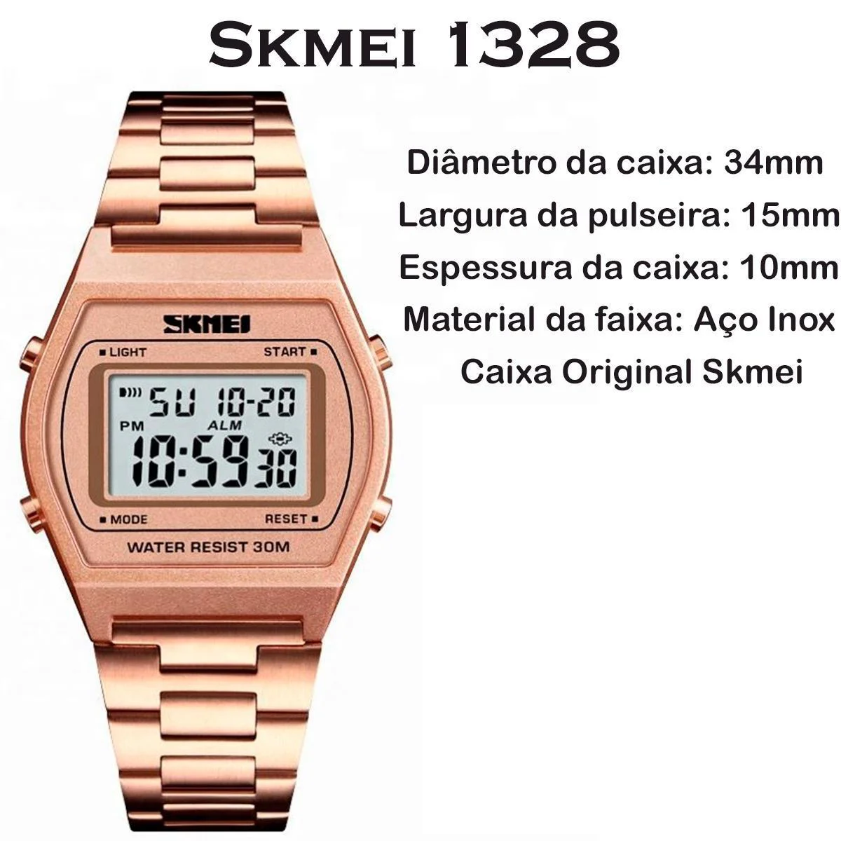 Relógio Masculino Feminino Skmei 1328 Digital Esportivo Casual Vintage Retrô Original Aço inoxCaracterísticas: Cronômetro; Resistente a água até 30 metros de profundidade; Relógio despertador; Relógio de 12/24 Horas; Luz de Led; Data;Especificações:Marca: SkmeiModelo: 1328Gênero: MasculinoMovimento: DigitalTipo de Exposição: DigitalFormato: QuadradoPeso: 0,47 gramasDiâmetro da caixa: 3,4 × 3,9 cmEspessura da caixa: 1,4 cmTipo de vidro: Vidro alto resistenteResistência à água: 30 m de profundidadeMaterial da base: Aço InoxidávelMaterial da armação: Aço InoxidávelEstilo: Esportivo de LuxoComprimento da pulseira: 23 cmLargura da pulseira: 1,5 cmMaterial da Pulseira: Aço InoxidávelFecho da pulseira: Fecho de Encaixar
